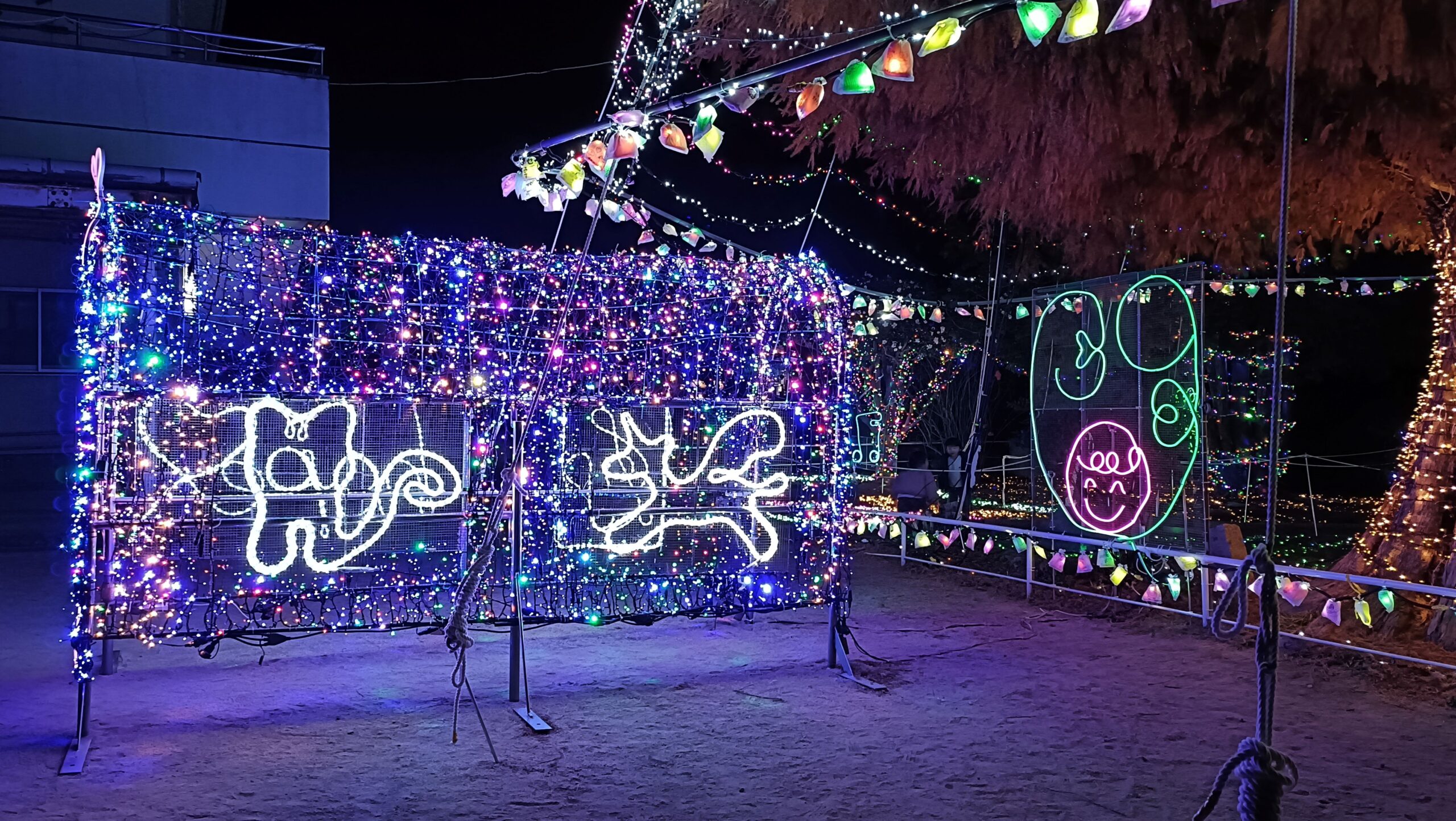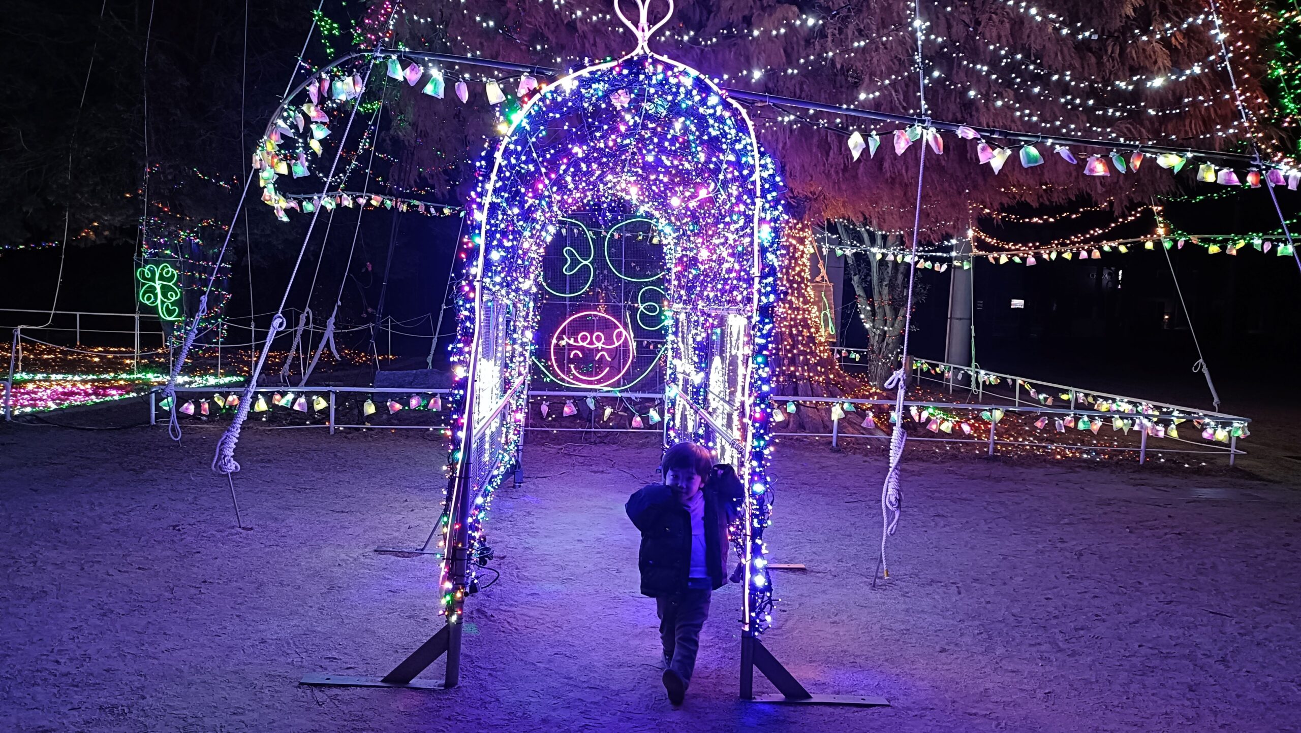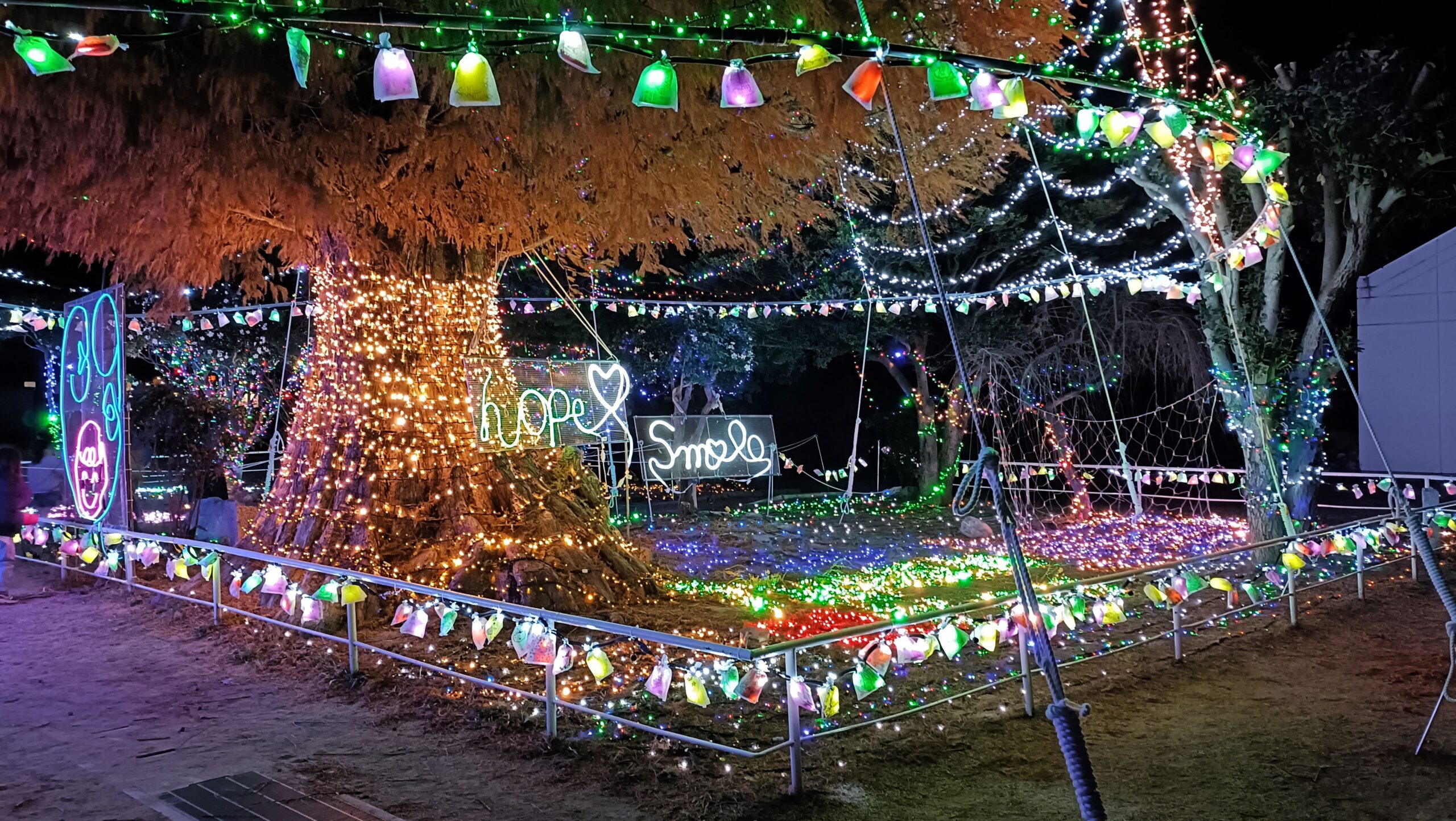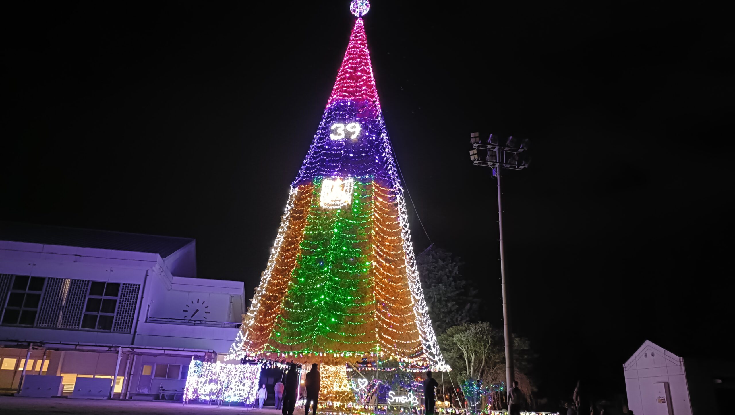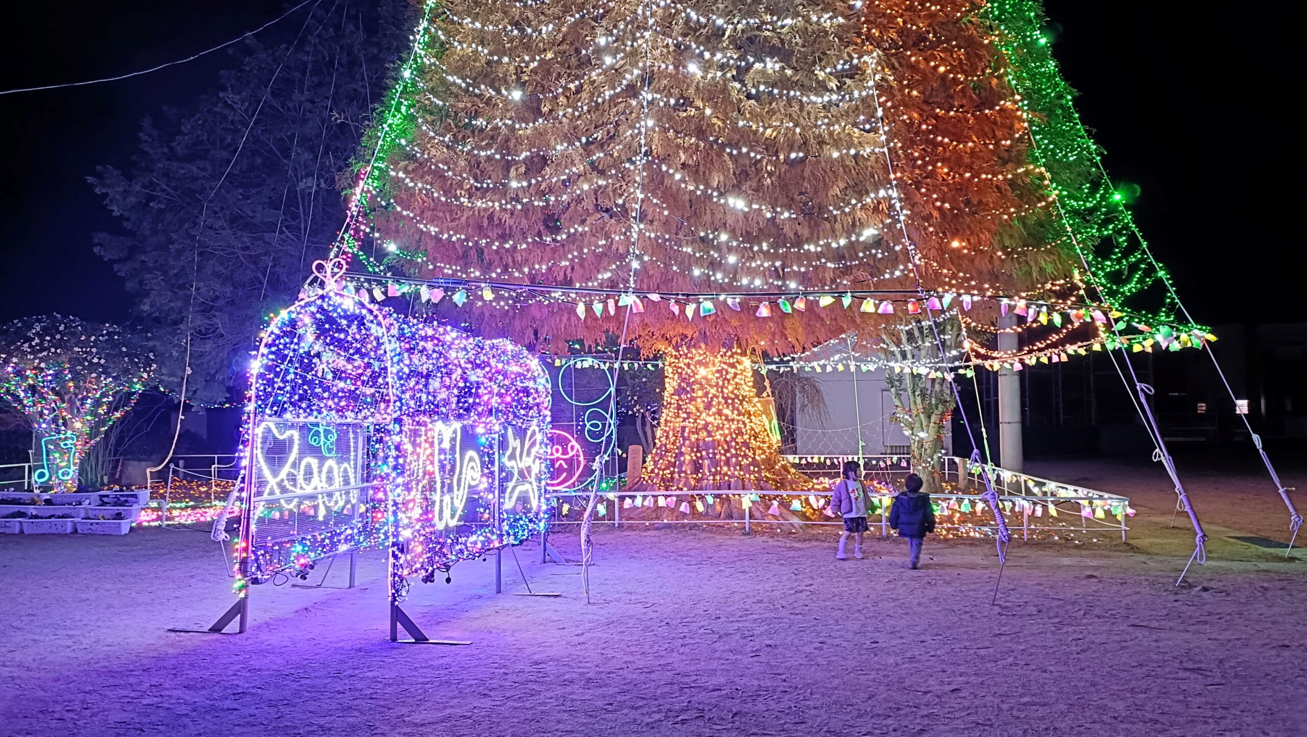 夜は、金栄小学校のイルミネーションへ。校庭にそびえる大きなクリスマスツリーは、学校のシンボルであるメタセコイアの木を飾った「ドリームツリー」。